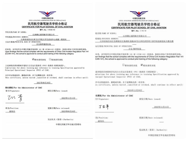 近日,江西飞行学院获颁中国民航局CCAR-141部民用航空驾驶员学校合格证(整体课程训练),这是江西省历史上首次获得该项资质,学校成为全省唯一一所、长江以南第一所、全国少数几所具备“学历+执照”一体化全过程培养飞行员资质和能力的高校,标志着学校在构建航空飞行人才全过程培养生态中实现重大突破,也意味着学校朝着建成具有鲜明航空飞行和通航服务特色高水平应用型大学目标又迈出重要一步。