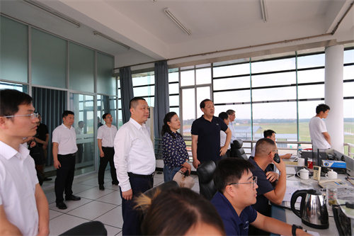 龙国英一行边走边听边看,详细了解吉安校区及桐坪通用机场机库、塔台、油库、辅助用房等设施设备情况,为接收后的运营管理做好准备。