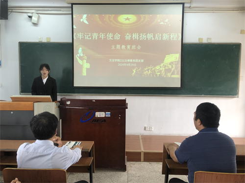 肖鸿晶在一教403教室参加了232法律事务班“牢记青年使命、奋楫扬帆启新程”主题教育班会。同学们观看了《何为青春、青春何为》主题教育视频片段;3名同学分享了自己的学习感悟。肖鸿晶作为“红色班级”232法律事务班名誉辅导员强调,五四青年节来临之际,希望同学们牢记习近平总书记殷殷嘱托,争做有理想、敢担当、能吃苦、肯奋斗的新时代青年。自觉坚持党的领导,听党话、感党恩,跟党走,用智慧和汗水为民族复兴铺路架桥,为祖国建设添砖加瓦,真正成为祖国建设的栋梁之材。