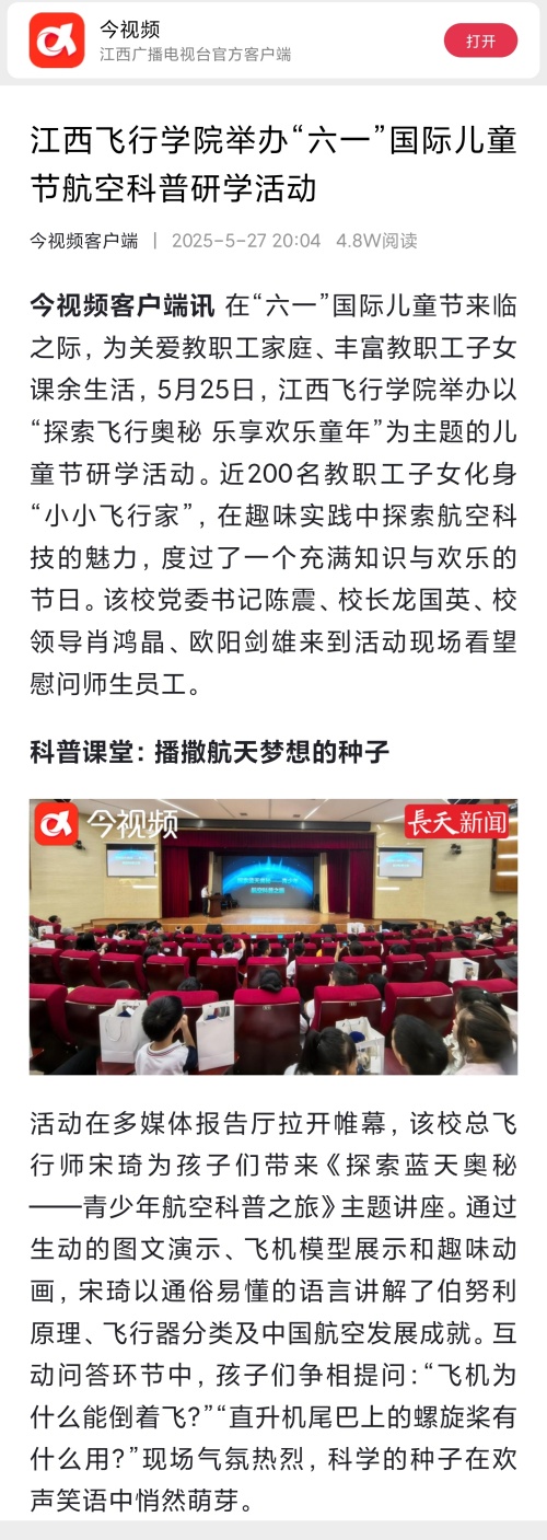 近日,今视频报道,江西飞行学院举办“六一”国际儿童节航空科普研学活动,详情如下: