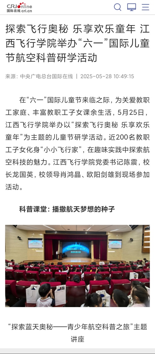 央广国际在线:探索飞行奥秘 乐享欢乐童年 江西飞行学院举办“六一”国际儿童节航空科普研学活动