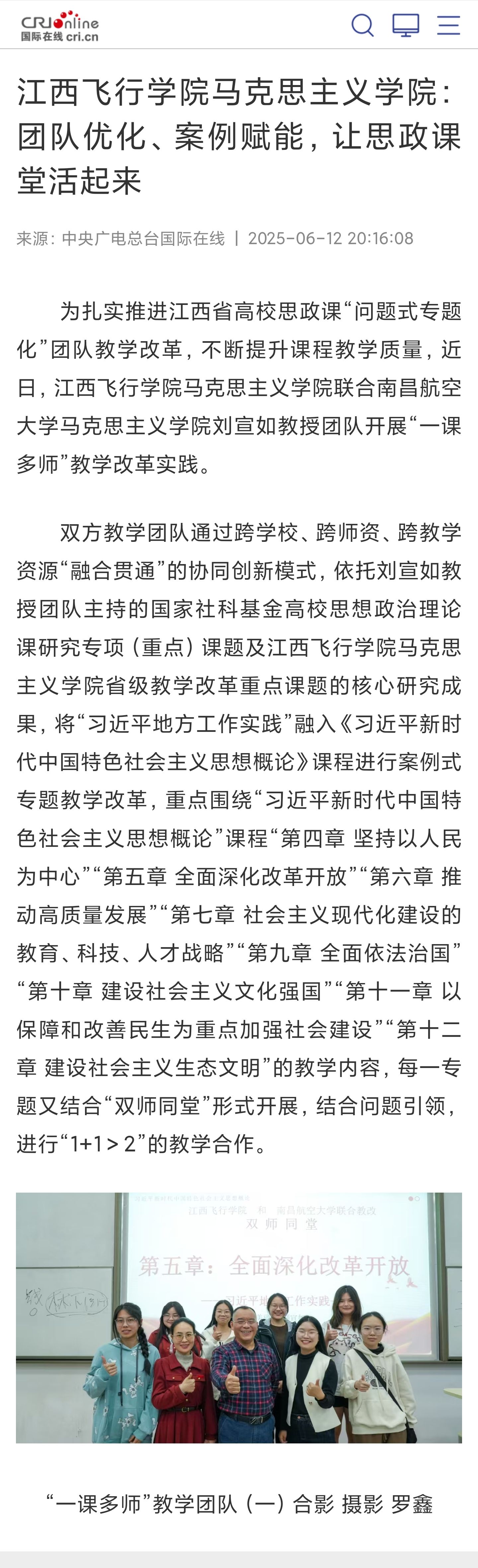 央广国际在线:江西飞行学院马克思主义学院:团队优化、案例赋能,让思政课堂活起来