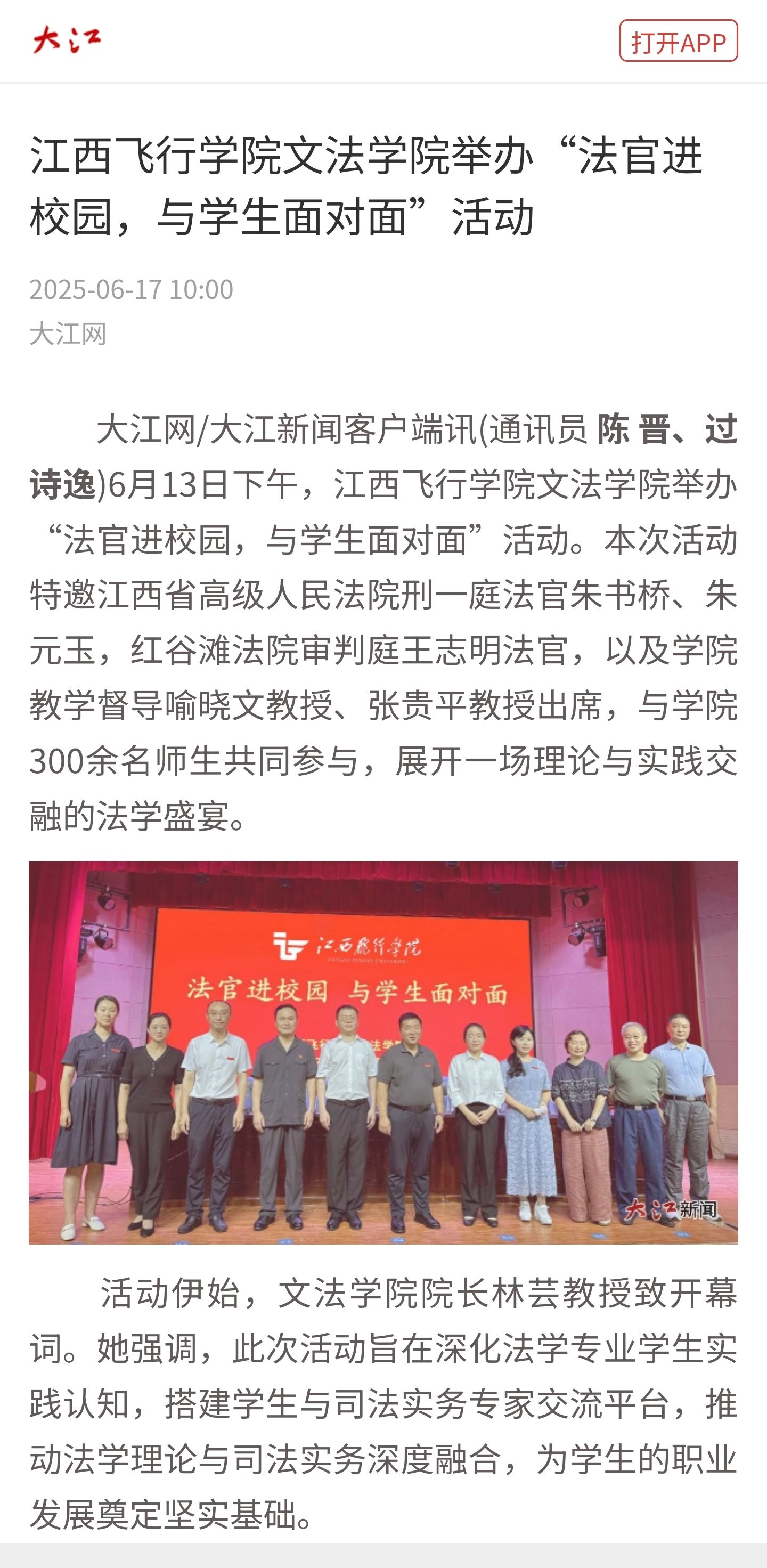 近日,大江网报道,江西飞行学院文法学院举办“法官进校园,与学生面对面”活动详情如下