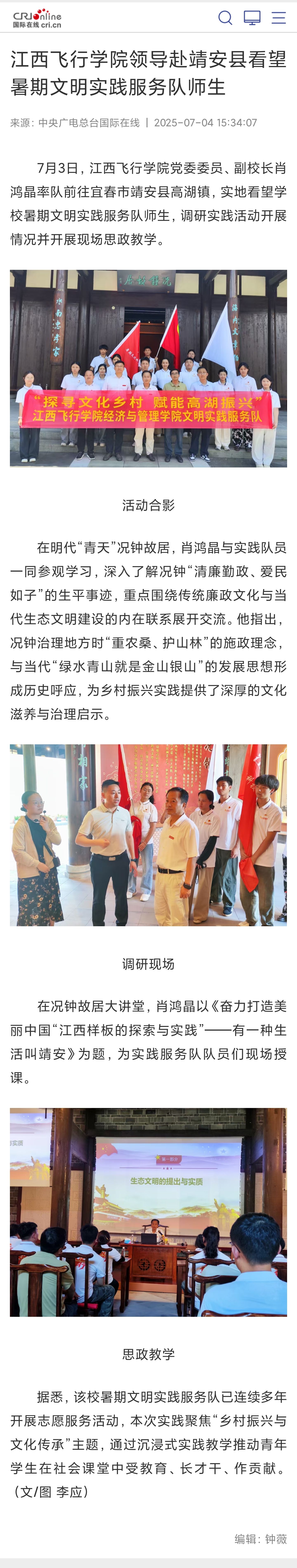 近日,央广国际在线报道,江西飞行学院领导赴靖安县看望暑期文明实践服务队师生详情如下