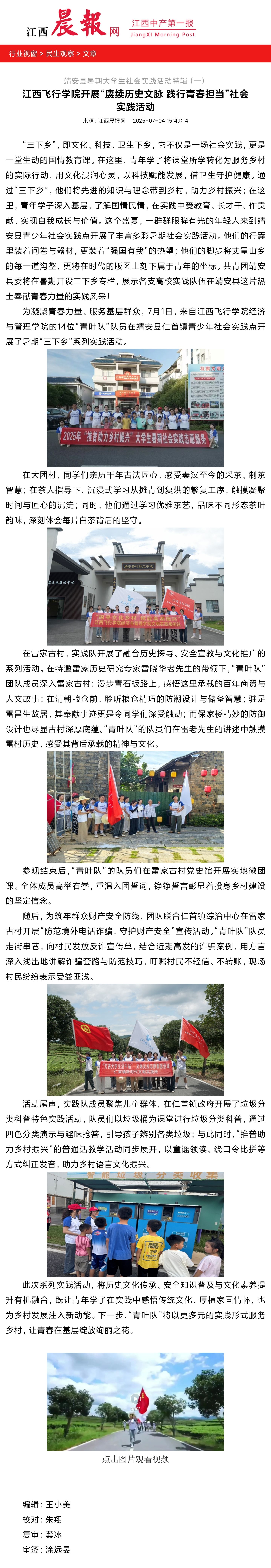江西晨报网:靖安县暑期大学生社会实践活动特辑(一)江西飞行学院开展“赓续历史文脉 践行青春担当”社会实践活动