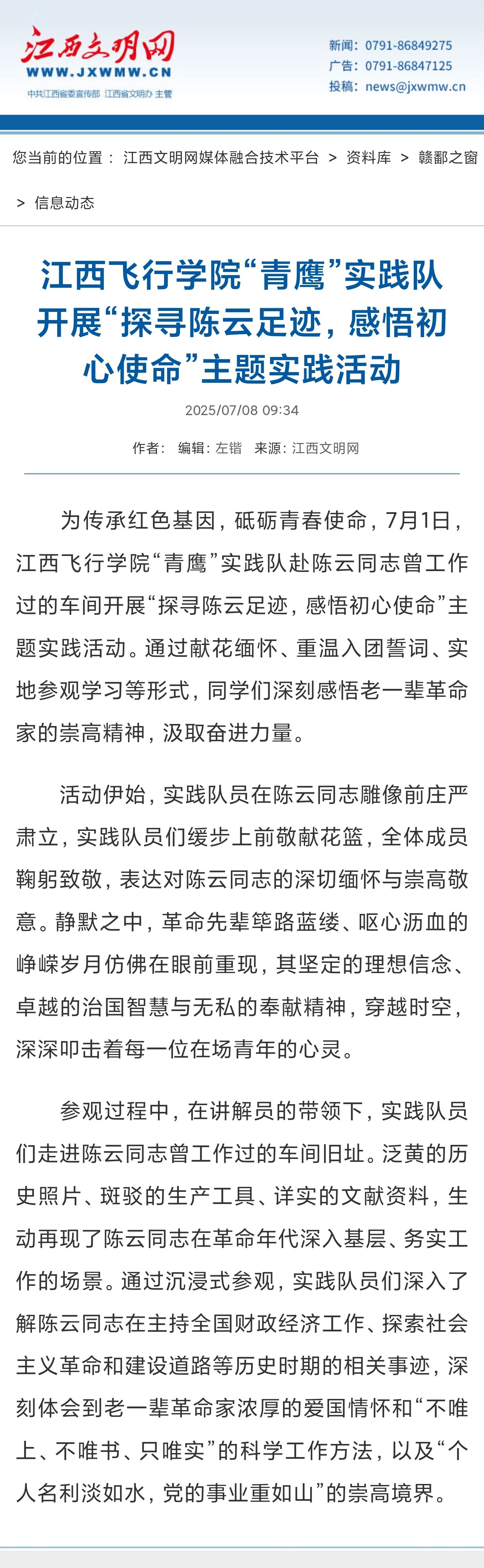 近日,江西文明网报道,江西飞行学院“青鹰”实践队开展“探寻陈云足迹,感悟初心使命”主题实践活动详情如下: