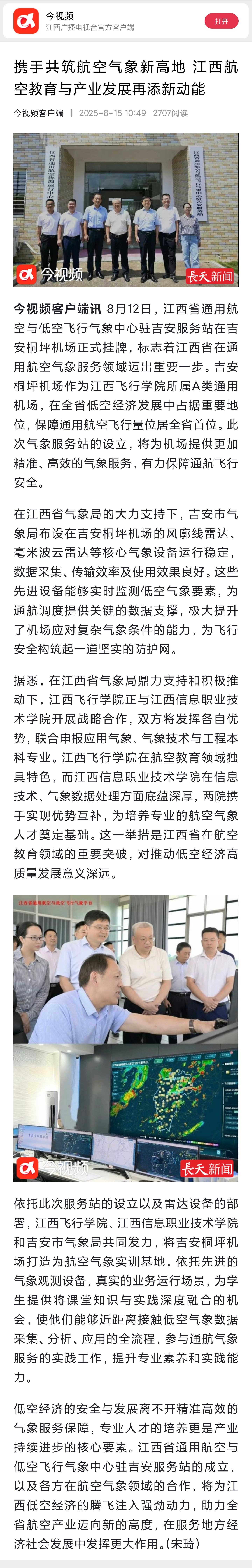近日,今视频报道,携手共筑航空气象新高地 江西航空教育与产业发展再添新动能详情如下