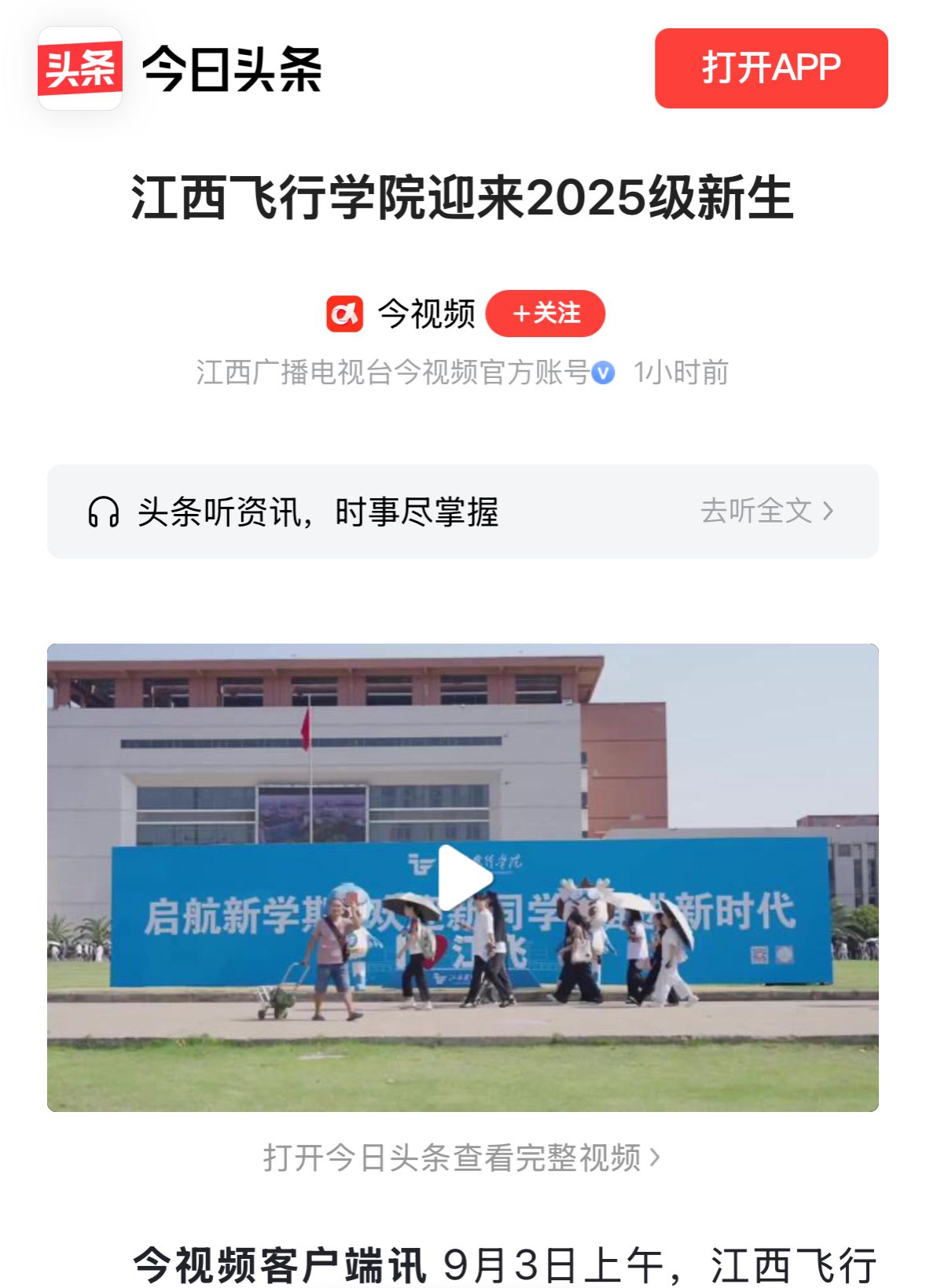 近日,今日头条报道,江西飞行学院迎来2025级新生,详情如下:
