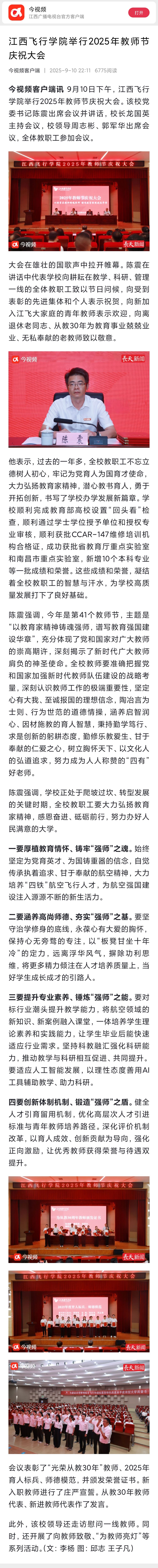 近日,今视频报道,江西飞行学院举行2025年教师节庆祝大会详情如下: