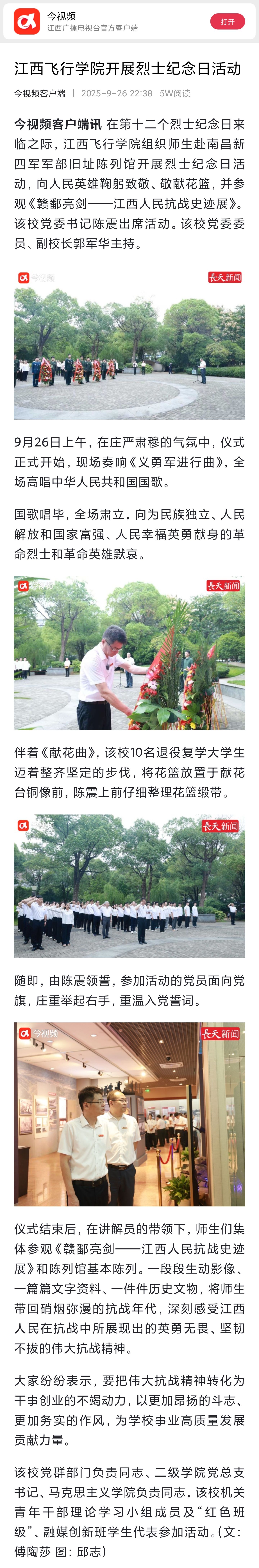 近日,今视频报道,江西飞行学院开展烈士纪念日活动详情如下