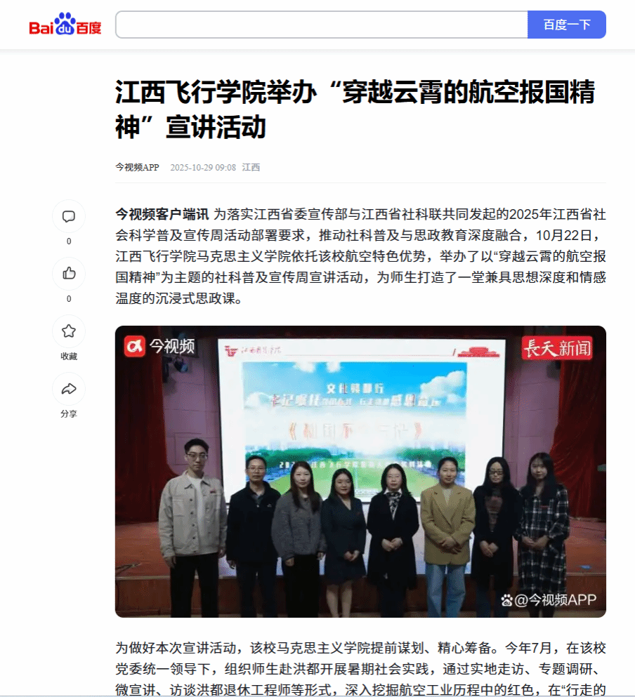 近日,百度报道,江西飞行学院举办“穿越云霄的航空报国精神”宣讲活动详情如下: