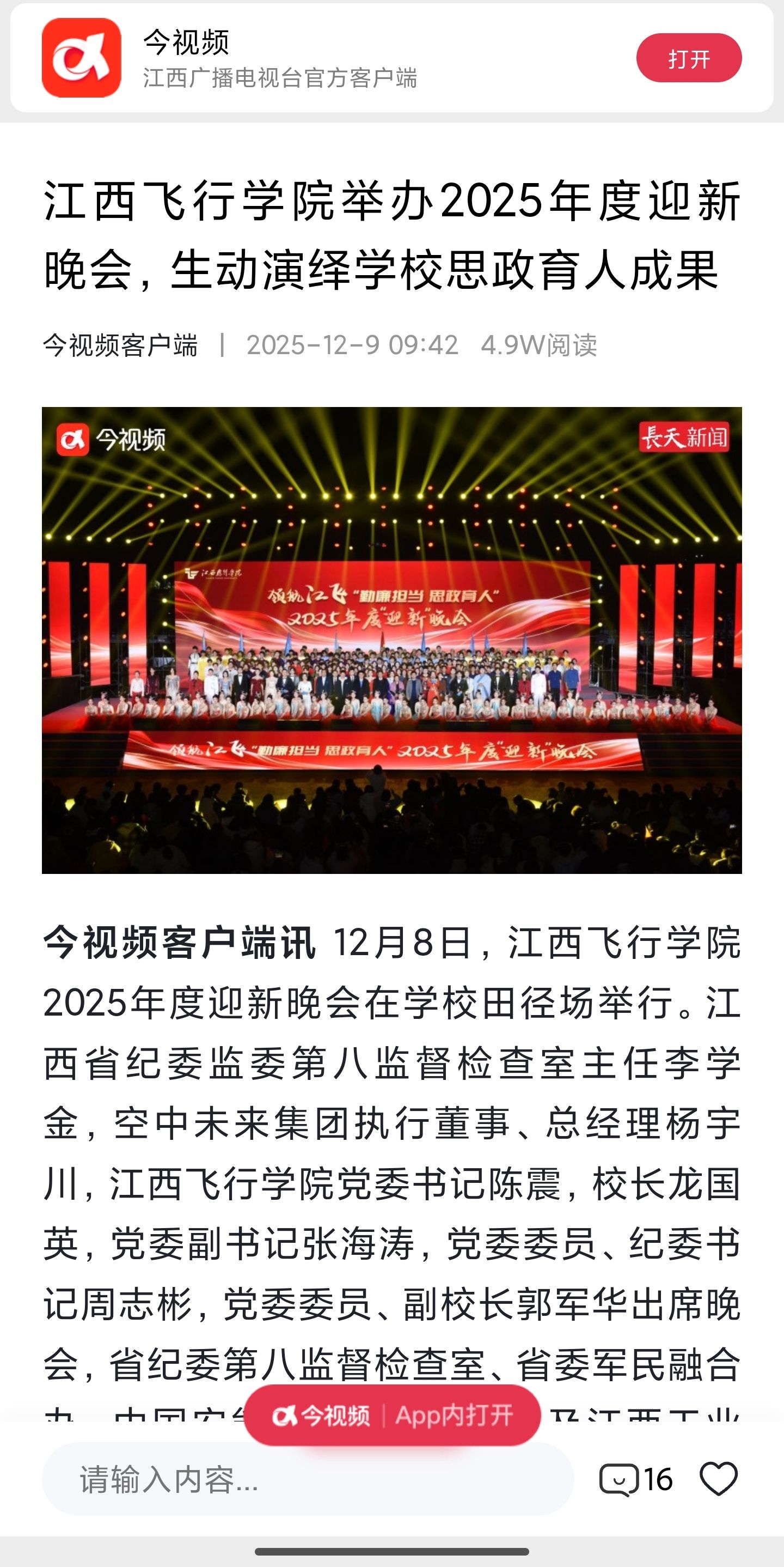 近日,今视频报道,江西飞行学院举办2025年度迎新晚会,生动演绎学校思政育人成果详情如下:
