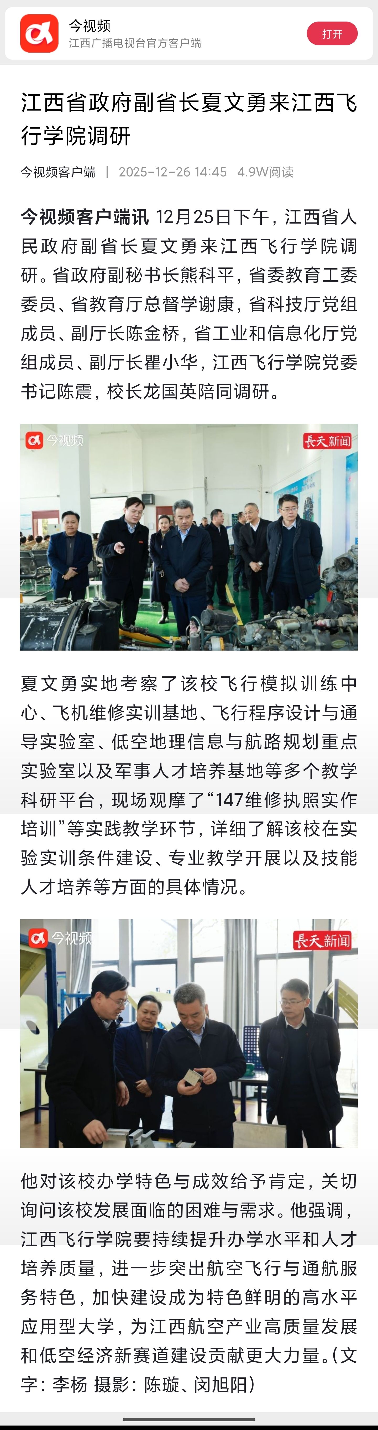 近日,今视频报道,江西省政府副省长夏文勇来江西飞行学院调研详情如下