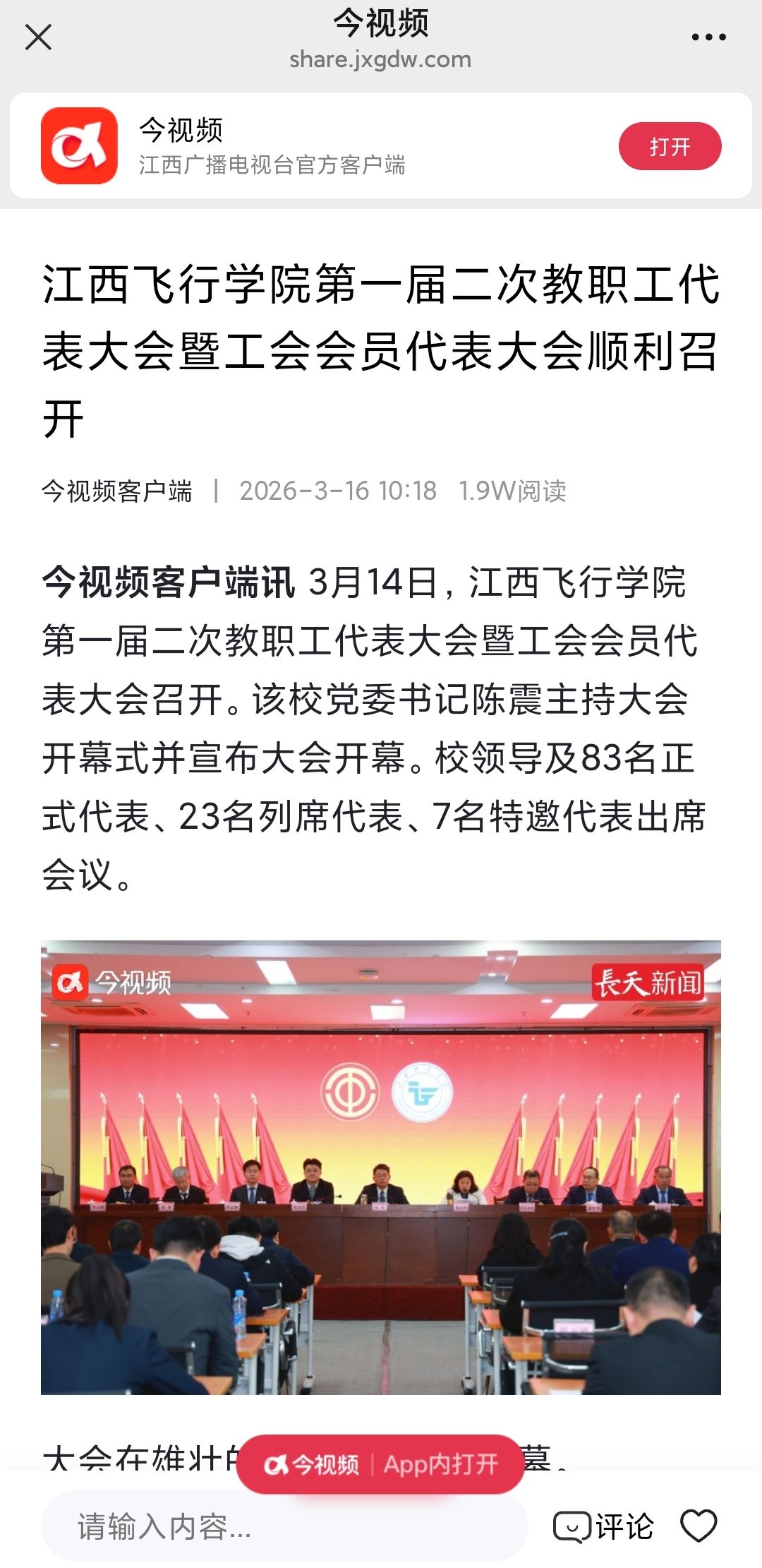 近日,今视频报道,江西飞行学院第一届二次教职工代表大会暨工会会员代表大会顺利召开详情如下: