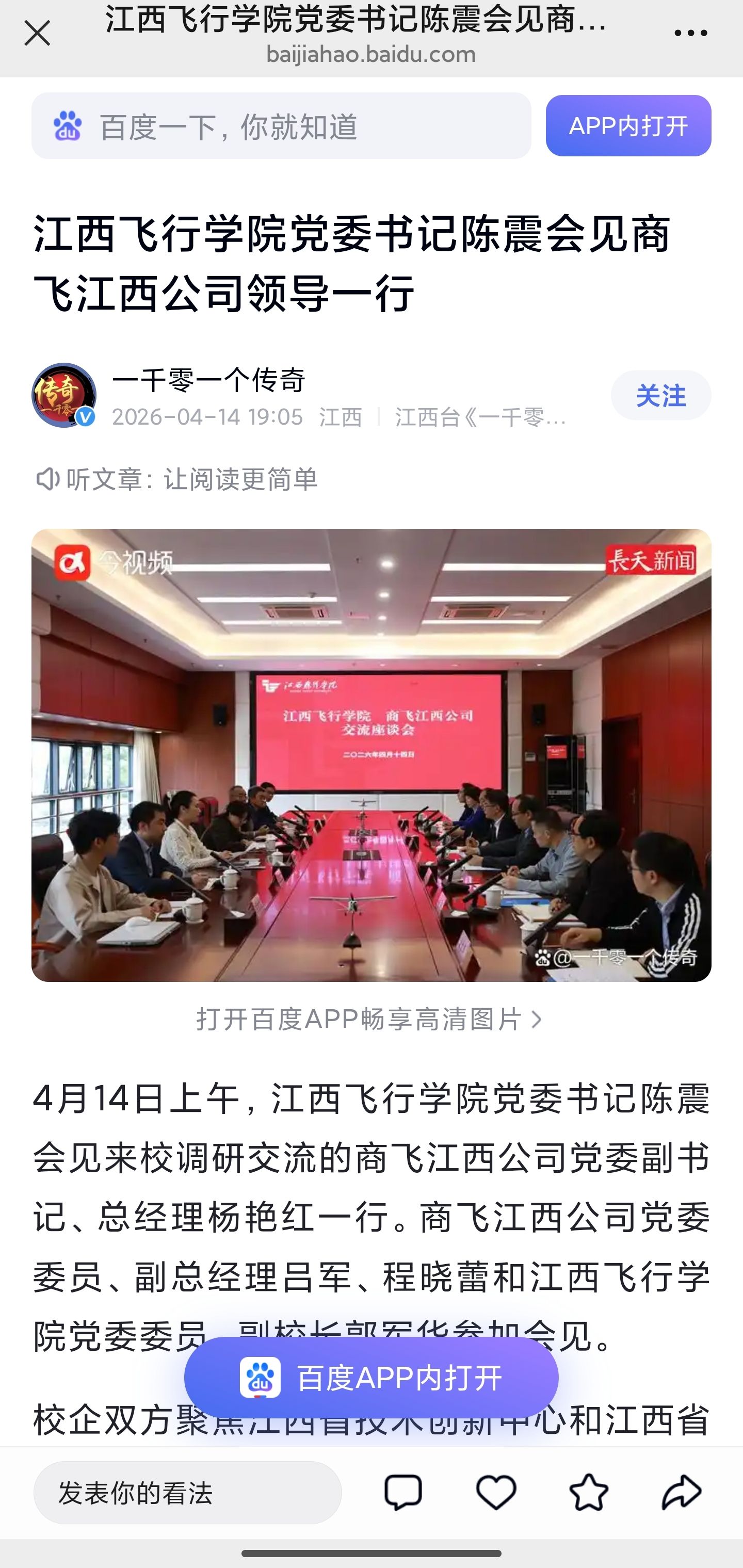 近日,百度网报道,江西飞行学院党委书记陈震会见商飞江西公司领导一行详情如下