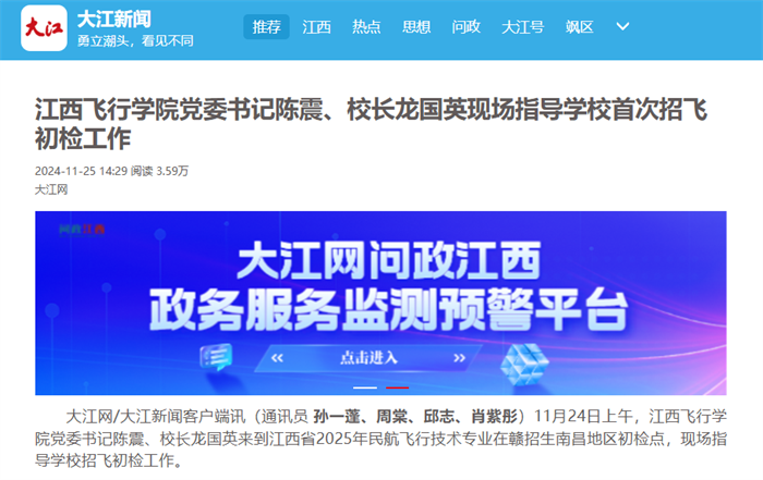 大江网:江西飞行学院党委书记陈震、校长龙国英现场指导学校首次招飞初检工作