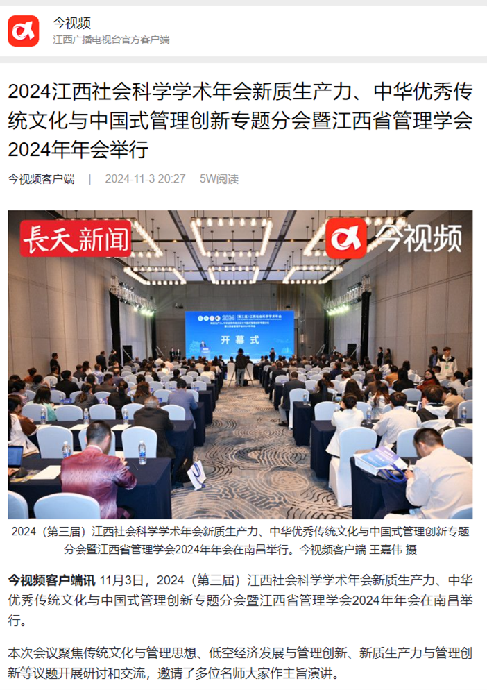 近日,今视频报道,2024江西社会科学学术年会新质生产力、中华优秀传统文化与中国式管理创新专题分会暨江西省管理学会2024年年会举行,详情如下: