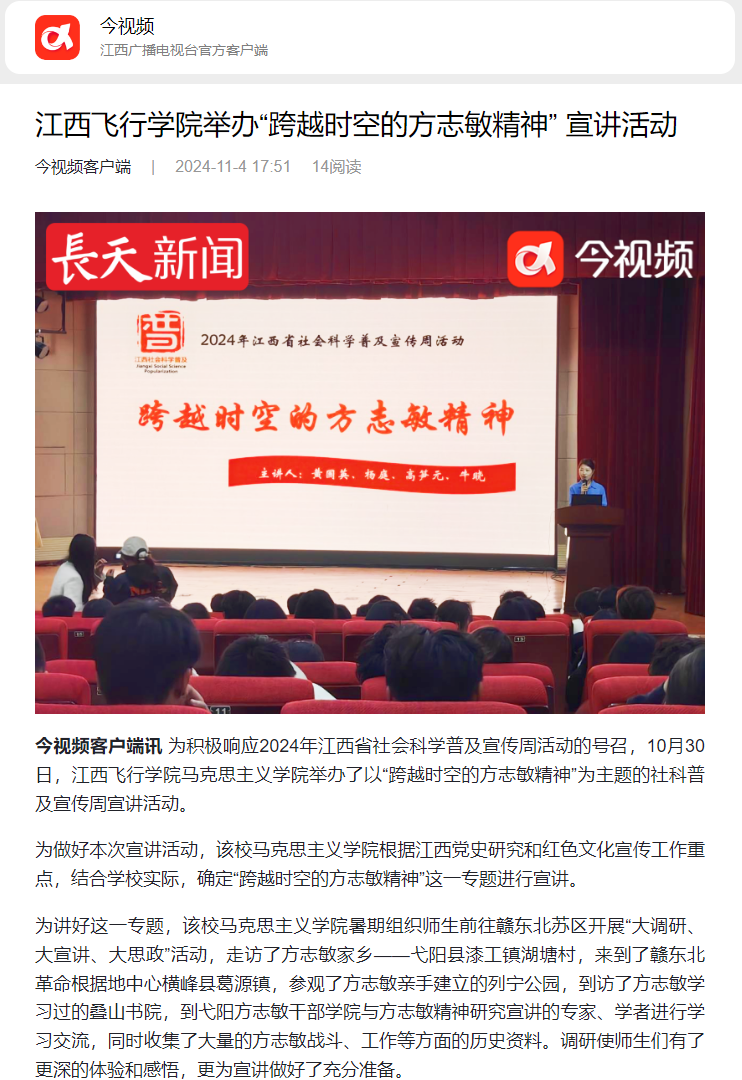 近日,今视频报道,江西飞行学院举办“跨越时空的方志敏精神” 宣讲活动,详情如下:
