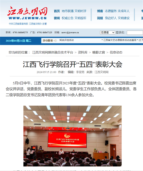 近日,江西文明网报道,江西飞行学院召开“五四”表彰大会。详情如下: