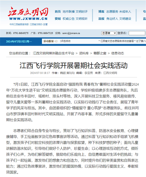 近日,江西文明网报道,江西飞行学院开展暑期社会实践活动。详情如下: