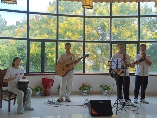 在活动当天,伴随着《奉献》、《真的爱你》等曲目的深情旋律,吉他协会的成员们以精湛的技艺和满腔热情,迅速吸引了在场教师的注意。主唱姚大利与吉他手邱仁德、郭麟,以及鼓手吴佳瑜之间的完美协作,为整个活动营造了温馨幸福的氛围。他们的演出不仅展示了学生对音乐的热爱,也将对教师的感激之情融入每一个音符,使在场的教师深刻感受到了学生们的真挚情感。