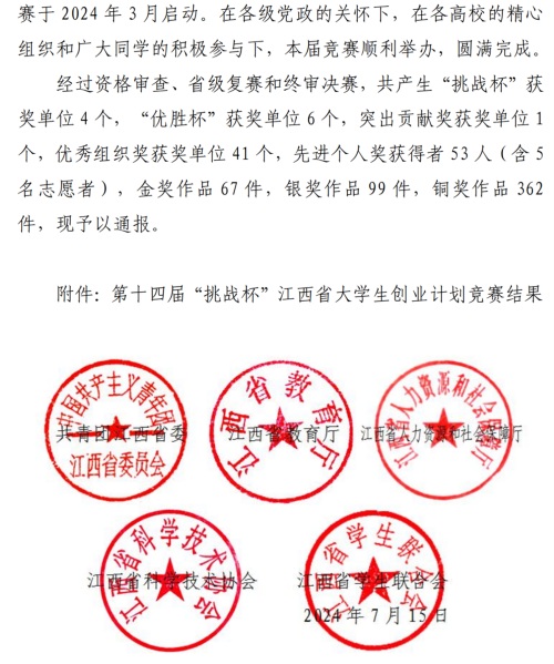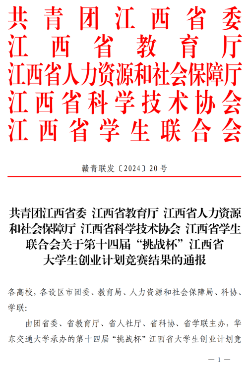 近日,由团省委、省教育厅、省人社厅、省科协及省学联联合主办的第十四届“挑战杯”江西省大学生创业计划竞赛圆满结束。学校团队项目《用于高层建筑灭火的双枪无人机设备》以及《无人机集群应急通信组网系统》均荣获第十四届“挑战杯”铜奖。