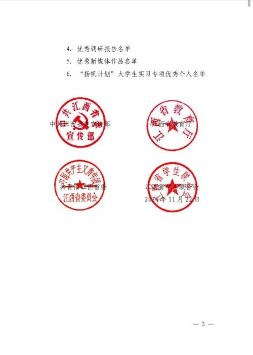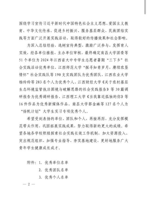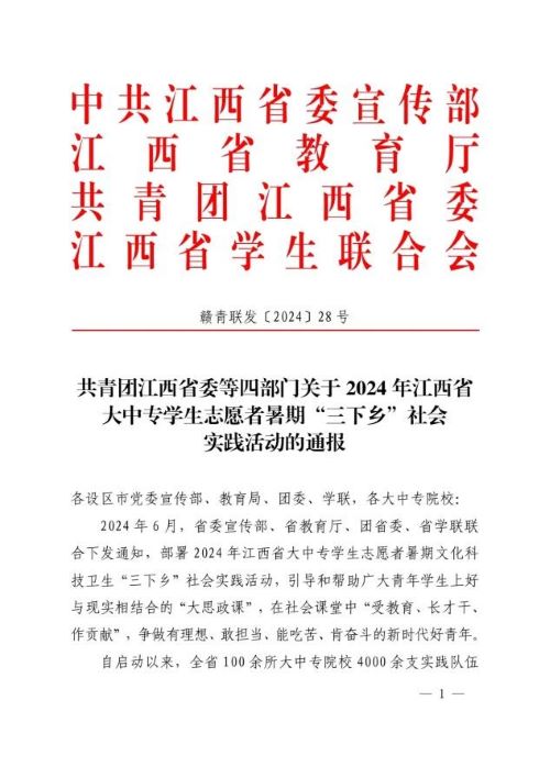 近日,省委宣传部、省教育厅、团省委、省学联联合下发通知,对在2024年江西省大中专学生志愿者暑期“三下乡”社会实践活动中表现突出的个人进行表彰,校团委魏颖荣获“优秀个人”称号。