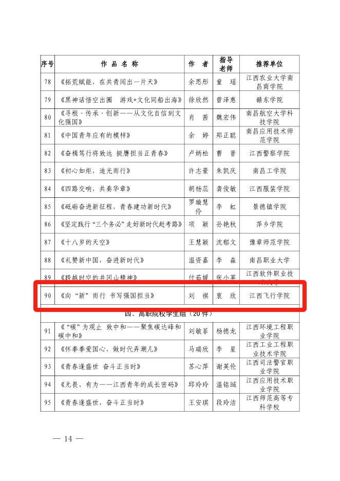 近日,由中共江西省委教育工委、共青团江西省委主办的第八届江西省学校共青团“微团课”大赛决赛落下帷幕。在我校团委副书记衷欣的指导下,财务与金融学院学生刘祺的参赛作品《向“新”而行 书写强国担当》荣获本科高校学生组三等奖。