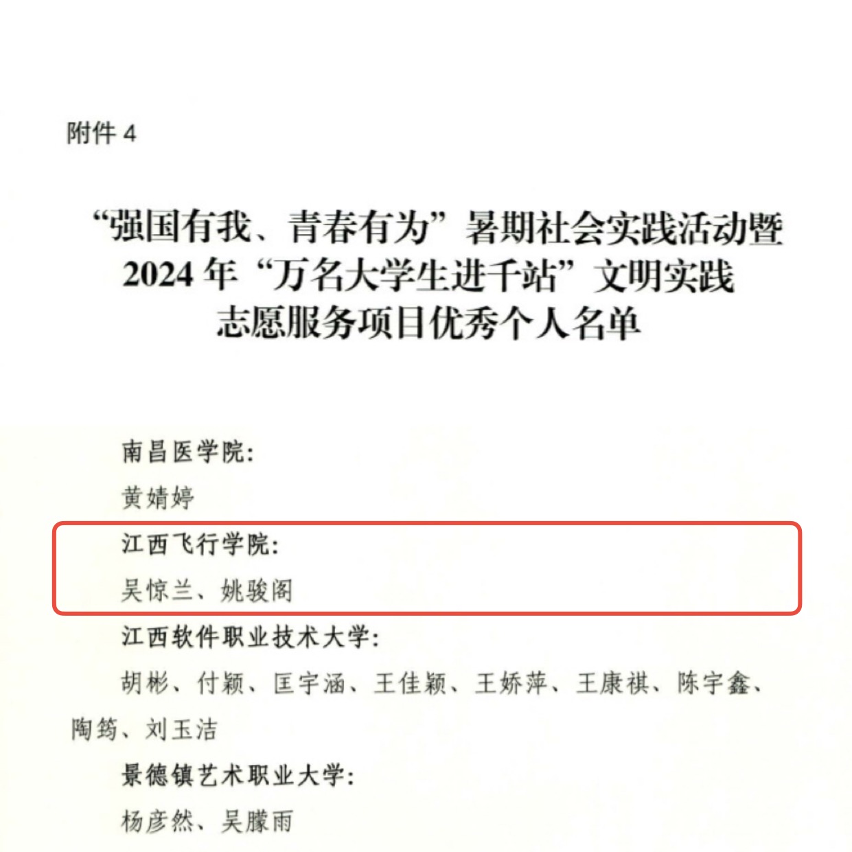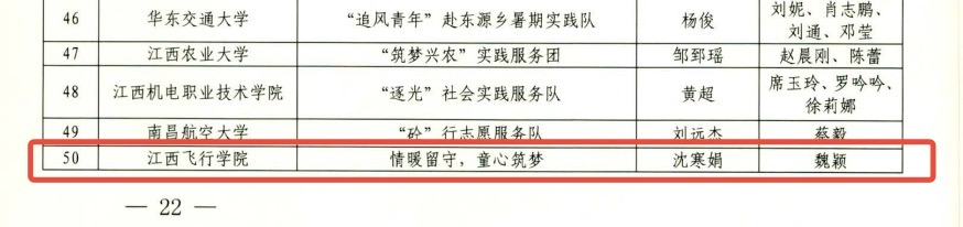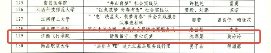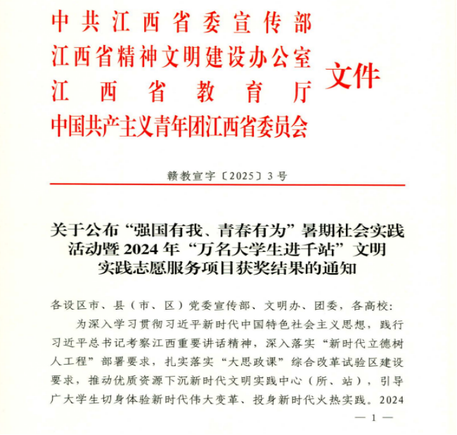近日,江西省教育厅公布了关于“强国有我、青春有为”暑期社会实践活动暨2024年“万名大学生进千站”文明实践志愿服务活动的获奖名单。我校“情暖留守, 童心筑梦”团队荣获“优秀团队”荣誉称号,魏颖、黄玲玲两位老师荣获“优秀指导教师”荣誉称号,吴惊兰、姚骏阁荣获“优秀个人”荣誉称号。