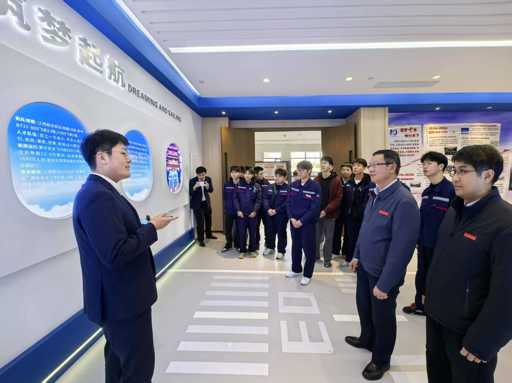 在江西航空相关领导的陪同下,师生们首先参观了公司企业文化馆,深入了解江西航空的发展历程、企业文化及行业贡献。随后,大家前往争先馆及园区参观,近距离感受航空企业的训练模式与技术应用。