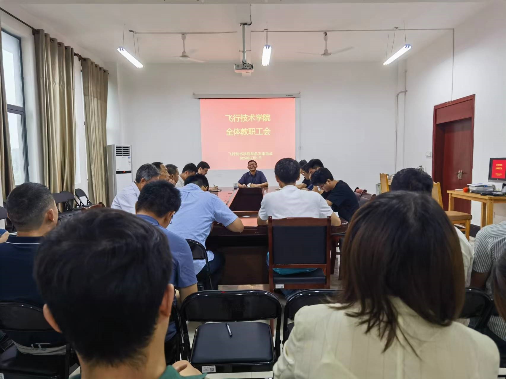 2024年7月1日上午,飞行技术学院在4235会议室召开全体教职工会议。党总支书记郭青山、副院长徐剑锋、党总支副书记樊斌、副院长程斌及全体教职工参加了会议。