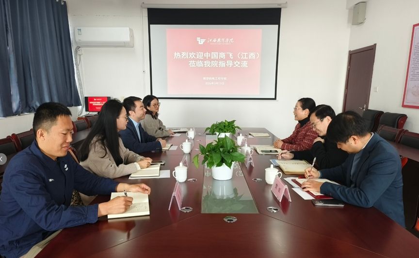 上午10时,中国商飞(江西)公司与航空机电工程学院、航空维修培训中心在科技楼617举行座谈会。航空机电工程学院党总支书记艾玮代表学院对商飞(江西)公司的到访表示热烈欢迎并介绍了学院的有关情况。航空维修培训中心主任徐剑锋介绍了学校执照培训相关内容。商飞江西公司党群与人力资源部唐超昱详尽介绍了企业的发展战略、人才需求以及岗位情况。他表示,国产大飞机事业正处于快速发展阶段,迫切需要大量专业基础扎实、实践能力卓越的优秀人才加入,江西飞行学院航空机电工程学院的专业设置与企业需求高度匹配,希望以此次招聘会为契机,进一步深化校企合作。双方还围绕学生联合培养、实习基地建设、课程共建等事宜展开了自由交流,并达成了多项合作共识。