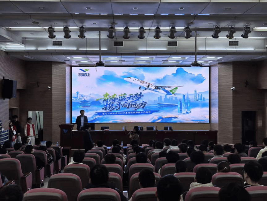 座谈会后,中国商飞(江西)公司宣讲会在二教视频中心举行,吸引了上百名江西飞行学院同学到场聆听。中国商飞(江西)公司唐超昱围绕中国商飞的发展历程、C919和ARJ21等国产民用飞机的研制成果、商飞(江西)公司的定位及未来规划、招聘岗位与职业发展路径等方面,进行了生动且详实的宣讲。现场气氛热烈,同学们认真聆听、踊跃提问,对国产大飞机事业和商飞(江西)公司展现出浓厚的兴趣。