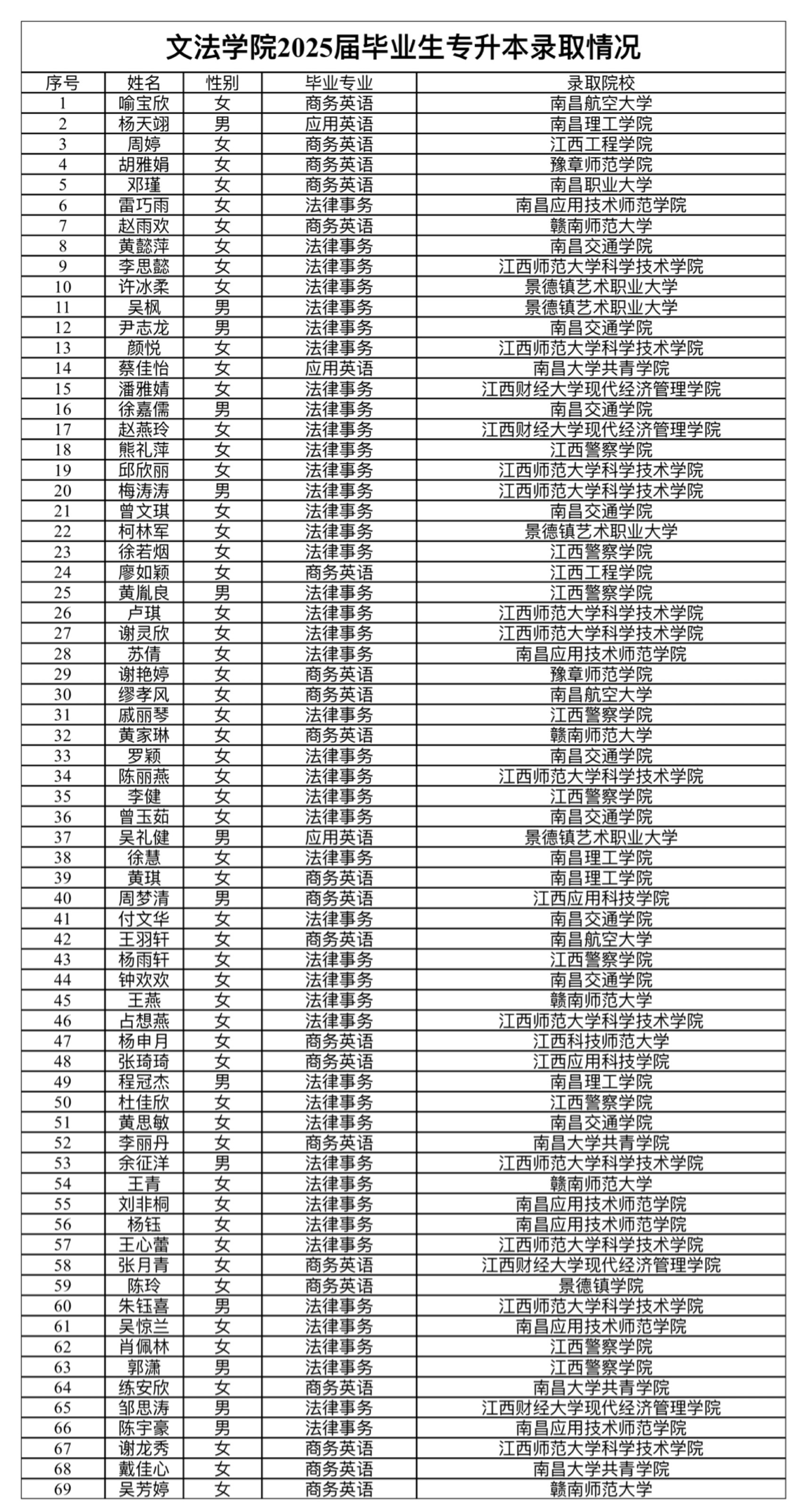 近日,2025年江西省普通高等教育专升本考试录取结果公布,文法学院学子凭借扎实的专业基础与不懈努力,在升学竞争中喜获佳绩。本届毕业生共235人,其中132人参加考试,78人成绩达线,上线率59.09%;69人被本科院校录取,录取率达52.27%。
