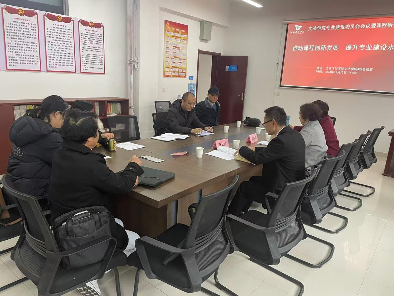 12月12日,文法学院在科技楼402会议室召开主题为“推动课程创新发展 提升专业建设水平”的专业建设委员会会议暨课程研讨会。出席会议的校外专家有:南昌工程学院外国语学院行政负责人肖永贺副教授、南昌大学法学院法律系主任李士林教授、江西科技师范大学外国语学院彭雪华教授、南昌优恩教育咨询公司总经理王治、江西景宁科技集团有限公司副总经理董媛媛、贝尔安亲南师附小校区执行校长付晶晶。校内专家有:学校督导喻晓文教授以及飞行技术学院王玲玲副教授。文法学院全体教师参加会议,会议由文法学院院长林芸主持。