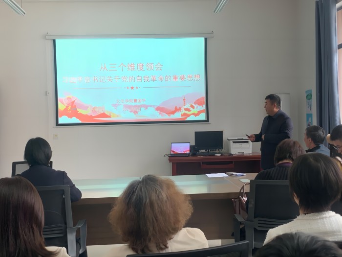 3月27日,文法学院党总支在402会议室开展主题党日活动。党总支副书记曹国平以“从三个维度领会习近平总书记关于党的自我革命的重要思想”为题,给全院党员、群众教师讲述专题党课。