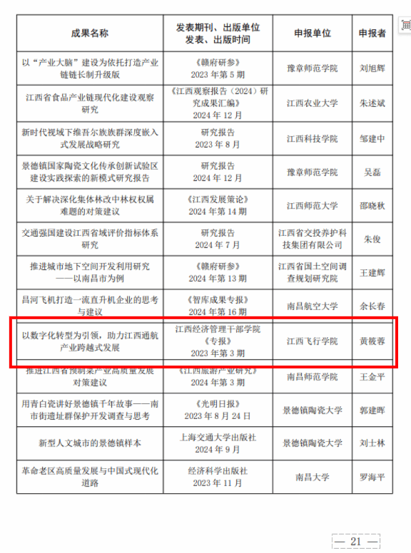 近日,江西省第二十一次社会科学优秀成果奖获奖名单正式公布。江西飞行学院文法学院黄筱蓉教授申报的成果《以数字化转型为引领,助力江西通航产业跨越式发展》荣获优秀成果二等奖。